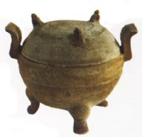子母口,口側(cè)有高於鼎蓋的長(zhǎng)方形鏤空雙耳,耳上部外撇,耳面飾獸紋。深腹,腹中有折棱一道。圓底,下置三獸足。此器為仿青銅鼎模羊燒造,造型古樸典雅,藝術(shù)性豐富。是西漢時(shí)期婺州窰的原始瓷的代表作。