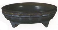敞口,淺腹,下承以三如意頭形足。外口沿下及腹部近底處各塑鼓釘一周。通體施仿鈞釉,釉面釉蚯蚓走泥紋,底露一周支釘痕。