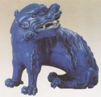獅前足站立,後足坐臥,回首遠(yuǎn)望,燮目圓睜,張口露齒,體魄雄健,身飾凸起雲(yún)紋。通體施孔雀綠釉,釉色濃重蔥翠,有細(xì)小開片?兹妇G釉為顏色釉的一種,清康熙時極盛。此品為傳世品。