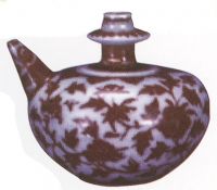 小口,短頸,扁圓腹,肩部置i短流,無(wú)柄腹部滿飾釉里紅纏枝牡丹紋。此器為軍特,為佛教僧侶俑器。此器造型別致,胎質(zhì)細(xì)膩潔白,紋飾清晰,線條流暢,色澤艷麗,反應(yīng)出釉里紅燒造水平。