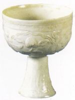 直口,深腹,高足。外壁口沿下模印回紋一周,下飾菱花形開光,內(nèi)為折枝荔枝,近足處印重疊蓮瓣紋,圈足上飾蕉蕖圖案,下為卷草紋。施青白釉,釉面明潤。此器製作精細(xì),胎體輕薄,紋飾精美少見。