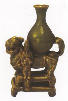 器為二層臺上站立一瑞獸,瑞獸背上駄一寶瓶。瓶撇口,束頸,圓腹。瑞獸旁邊立有一人,手握韁繩。通體施青釉,釉色青翠,釉面光潤柔和。此器造型別致少見,構思巧妙,是金代耀州窰瓷器的佳品。