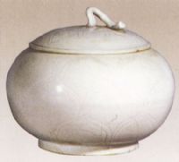 器呈扁圓形,斂口,鼓腹,圓足,瓜蒂鈕蓋。腹部刻畫三重蓮瓣紋,底刻“官”字款。通體施白釉。