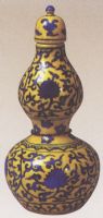 瓶呈葫蘆形。直口,上下腹呈球狀,中部束腰,圈足。圓蓋,珠鈕。通體黃釉色地繪青花.紋飾。上、下腹部紋飾為纏枝蓮紋,底部青花,楷書“大明嘉靖年制”款。