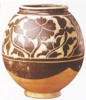 罐腹部飾褐釉剔花折枝牡丹紋,剔花技法筒練、撲拙自然,構(gòu)圖圓滿、線條流惕,胎體厚重,胎質(zhì)較粗,為西夏靈式窯的產(chǎn)品。西夏以此項(xiàng)羌族為主體建立的政權(quán),經(jīng)濟(jì)生活以畜牧業(yè)為麴主。