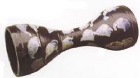 腰鼓呈長圓筒形,兩頭粗中腰細(xì),鼓身凸起七道弦紋,通體施黑釉,釉色漆黑光亮,并飾有藍(lán)色斑塊。此鼓形制較大,器形規(guī)整,腺條柔和優(yōu)美。