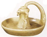 燈柱堆貼塑成直立的牛形,牛頭向前突出,并用褐色點染雙眼,嘴部,器施青釉。此器造型獨具匠心,製作精細,青釉均勻,色純凈光潤。