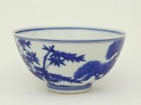碗口微撇,弧腹,圈足。白釉,青花發(fā)色濃艷,碗口沿內(nèi)外及足墻均飾青花雙環(huán)線。碗心繪團(tuán)云紋,外壁滿繪松竹梅紋。外底署青花“大清宣統(tǒng)年制”雙行六字楷書款。