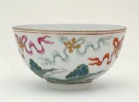 碗直口,弧腹,圈足。碗內(nèi)光素。外壁以粉彩為飾,口沿描金及紅線各一周,腹部主題圖案繪海水江崖,以江水、山石表示江山,其上為六組不同色彩的飄帶,每組飄帶的中心都有描金“卍”字,寓意“江山萬代”,此為光緒時期瓷器上常見的裝飾題材。外底署青花“大清光緒年制”雙行六字楷書款。