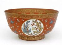 碗直口微敞,弧腹,圈足。口描金彩,口沿內(nèi)外均有描金回紋一周,碗內(nèi)壁紅地上描金“囍”字,里心飾金彩團(tuán)壽字,外壁紅地上有四個(gè)圓形開光,其內(nèi)皆飾龍鳳“囍”字,開光之間以花蝶紋相隔。外底白釉地上以紅彩書“長春同慶”四字楷書款。