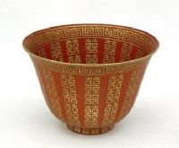 碗撇口,深腹,圈足。通體紅釉描金?谘貎(nèi)外及腹部近足處飾描金回紋,內(nèi)外壁和足墻飾描金彩“囍”字,內(nèi)底心描金團壽字紋。足底書礬紅彩“燕喜同和”四字楷書款。