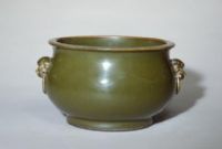 “茶葉末釉”是廠官釉的一種,這個(gè)仿銅器制作的瓷爐釉面潤澤,古意盎然。
