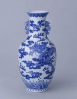 瓶撇口,直頸,溜肩,長(zhǎng)圓腹,圈足。頸的兩側(cè)對(duì)稱置螭耳。內(nèi)施白釉,外壁繪青花云龍紋,輔以如意云頭紋、海水紋、圈點(diǎn)紋等邊飾。圈足內(nèi)施白釉。外底署青花篆書(shū)“大清嘉慶年制”三行六字款。