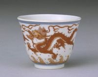 此盅仿清康熙器形燒制,曲線流暢,器形優(yōu)美,所繪云龍線條一絲不茍,為一件清代后期官窯制作的精美的酒具。