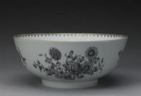 碗敞口,圈足。外壁用黑彩描繪簇?fù)淼母鞣N花卉紋,花蕊上用金彩點(diǎn)綴。口沿飾以金彩。碗內(nèi)心描金畫瑞典支票圖案,支票上日期注明是1762年8月11日,可以知道這只碗燒制的大致時(shí)間。