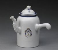 壺單柄,有蓋,桃形蓋紐,流彎曲且較長。通體在大面積的白地上,以粉彩中的藍(lán)、黃等彩加金繪制盾形飾章及字母“S”,口沿及蓋沿都飾有星形圖案。