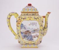 圖片名稱: 黃地開光粉彩山水人物紋四方茶壺