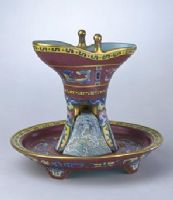 此爵杯在造型上仿照三代青銅器式樣。生產(chǎn)和使用瓷質(zhì)爵杯作為祭器是元明清三代的通例,此種形制的帶托盤爵杯,目前所知最早見于乾隆朝,清宮檔案記載,乾隆八年(1743年)御窯廠奉旨燒制的“洋彩”器中就有此種爵杯,一為胭脂紫色地,一為黃色地,軋道錦紋和夔紋,制作都極為精細。所見實物還有青花器,同類器物在光緒朝也有仿造。