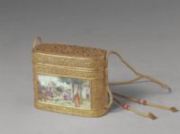 燧囊長方形,子母口,蓋、器身及底足側(cè)面均有穿帶孔,穿系黃繩,繩上有米珠、珊瑚珠裝飾。器內(nèi)施松石綠釉。外壁周邊飾描金卷草、朵花及纏枝花紋。器腹正反兩面有長方形開光,開光內(nèi)粉彩繪西洋人物“進寶圖”。底施松石綠釉,中部書紅彩“大清乾隆年制”六字篆書橫款。