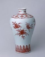 瓶小口,短頸,豐肩,腹以下漸收斂,圈足。通體以釉里紅裝飾,頸上繪朵梅、海水紋,肩、脛部分別繪蓮瓣、蕉葉紋,瓶身飾折枝桃、佛手、石榴三果。外底署青花篆書(shū)“大清乾隆年制”三行六字款。