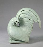 熏呈雄雞形,作俯臥回首狀。底部與雞身可以分離。通體施粉青釉,無款識。