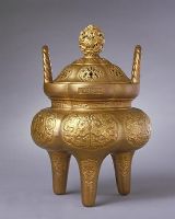 爐仿銅質(zhì)香爐的式樣,嵌入式爐蓋,直口,束頸,沖天繩耳,扁圓腹,下承三柱狀足?谘靥幱£栁“大清乾隆年制”六字橫排篆書款。通體施金彩,飾模印和鏤空花紋。蓋面均分為6瓣,每瓣圓形開光內(nèi)鏤雕雙螭紋,開光上方模印變形龍紋一周,蓋鈕為鏤空蓮花荷葉紋。爐頸部與爐身三個(gè)桃形開光內(nèi)凸印蟠螭紋,腿部凸印變形蟬紋。