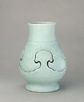 尊口外撇,短頸,溜肩,弧鼓腹,圈足跟外撇。通體施粉青釉,腹部模印獸面紋、云紋。在器腹中部采用鏤雕的手法把器腹分為上下兩部分,并以正、覆如意頭的造型相扣,內(nèi)置銅膽供插花用。外底以青花書“大清乾隆年制”三行六字篆書款。