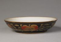 盤敞口,淺弧壁,圈足。盤里及足內施白釉。外壁仿黑漆描金工藝,在漆黑瑩亮的釉面上以金彩繪桃紋,桃花和桃實處適宜地點綴紅彩,使艷麗的花朵和熟透的鮮桃躍然盤上。