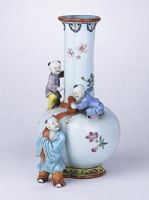 繪畫與堆塑相結(jié)合是清代瓷器紋樣裝飾的一項(xiàng)創(chuàng)新技法,在整個(gè)清代尤其是乾隆年間廣為流行。此瓶雕塑手法細(xì)膩生動(dòng),色彩素凈淡雅,堆塑的嬰孩使瓶體分外新穎別致,頗具情趣。