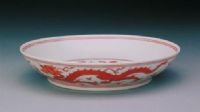 盤敞口,淺弧腹,圈足。盤內(nèi)外以礬紅彩裝飾。內(nèi)口沿處繪弦紋兩道,盤心繪一立龍,周圍襯以火焰紋,盤外壁繪雙龍戲珠紋。圈足內(nèi)施白釉,外底署青花楷書“大清雍正年制”雙行六字款,外圍青花雙圈。