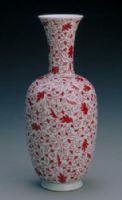 瓶撇口,細(xì)長頸,豐肩,肩以下漸收,圈足。通體在白釉地上用礬紅彩描繪纏枝甘藤紋。圈足內(nèi)施白釉。外底署青花楷書“大清雍正年制”雙行六字款,外圍青花雙線圈。