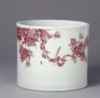 此筆筒胎堅(jiān)、釉潤。釉里紅的發(fā)色稍微不足,但正是這種缺陷所形成的層次,為畫面平添幾分情趣。筆筒上兩幅畫面的喻意是“探花及第”和“喜上眉梢”。用這種圖案裝飾筆筒,可謂恰到好處。