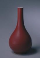 瓶直口,細長頸,削肩,鼓腹,圈足。因形似懸膽,故名“膽式瓶”。通體施高溫銅紅釉,釉面勻凈,色澤純正。圈足內(nèi)施白釉。外底署青花楷書“大清雍正年制”雙行六字款,外圍青花雙圈。