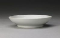 盤(pán)敞口,淺弧壁,圈足。內(nèi)外施白釉。盤(pán)內(nèi)以五彩描繪芭蕉樹(shù)、洞石、菊花、高士、童子等圖案。圈足內(nèi)施白釉。外底署青花楷書(shū)“大明成化年制”雙行六字仿款,外圍青花雙線圈。