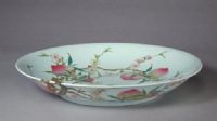 此盤形體碩大,造型端莊,紋飾主題寓意“洪福齊天”、“福壽雙全”。這種從器內(nèi)延伸至器外的畫面俗稱“過枝花”。清末寂園叟撰《陶雅》曰:“庚子后,所出五彩過枝之盤碗甚多,有桃實八枚綴于枝上者,索價亦甚巨。過枝云者,自此面以達(dá)于彼面。枝干相連,花葉相屬之謂,皆雍正官窯也。”此種畫法起源于清康熙時期,一直影響及道光時期,亦見有“過墻龍”、“過墻鳳”等。晚清以后這種畫法不多見。