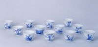 杯12件一套,撇口,深弧壁,圈足。內(nèi)外施白釉,外壁青花裝飾。其上分別繪有代表12個(gè)月的花卉,并且配有與之相對(duì)應(yīng)的詩(shī)句。分別是:一月,水仙花,“春風(fēng)弄玉來(lái)清書(shū) ,夜月凌波上大堤。”二月,玉蘭花,“金英翠萼帶春寒,黃色花中有幾般。”三月,桃花,“風(fēng)花新社燕,時(shí)節(jié)舊春濃。”四月,牡丹花,“曉艷遠(yuǎn)分金掌露,暮香深惹玉堂風(fēng)。”五月,石榴花,“露色珠簾映,香風(fēng)粉壁遮。”六月,荷花,“根是泥中玉,心承露下珠。”七月,蘭花,“廣殿輕香發(fā),高臺(tái)遠(yuǎn)吹吟。”八月,桂花,“枝生無(wú)限月,花滿自然秋。”九月,菊花,“千載白衣酒,一生青女香。”十月,芙蓉花,“清香和宿雨,佳色出晴煙。”十一月,月季花,“不隨千種盡,獨(dú)放一年紅。”十二月,梅花,“素艷雪凝樹(shù),清香風(fēng)滿枝。”詩(shī)句的結(jié)尾用書(shū)寫(xiě)的形式鈐青花篆體“賞”字。