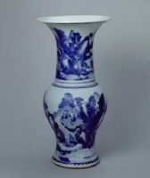 尊撇口,長頸,溜肩,腹以下漸斂,近足處外撇,圈足。通體青花裝飾。器身采用通景式構(gòu)圖繪山水人物紋,畫面中高山聳立,流水潺潺,幾位高士坐于石板之上或談笑風(fēng)生,或舉桿垂釣,悠然自得,表現(xiàn)出士大夫避世隱逸的生活情趣。肩部一側(cè)以青花料楷書“信士生員和德威喜助清溪古洞神前花瓶一枝祈保合家清泰 康熙乙未仲夏吉立”四行供養(yǎng)銘文。