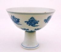 這件高足盅是仿明成化款的同類器,其青花色調(diào)淺淡,圖案輕描淡繪,線條纖細(xì)清晰,釉面乳白瑩潤,是仿明成化青花八寶高足盅的成功之作。