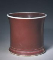 筆筒撇口,斜壁,足微外撇,臺(tái)階底,淺圈足。通體施霽紅釉,口沿處釉薄透出白色胎骨。近足處凸起兩道弦紋,微透白色胎骨。圈足內(nèi)施白釉。無款識(shí)。