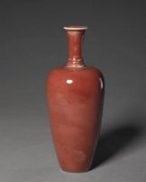 清代康熙朝晚期景德鎮(zhèn)創(chuàng)燒的豇豆紅釉屬于高溫銅紅釉,它是各種銅紅釉器物中最精妙的一種,因釉面酷似豇豆皮的顏色而得名。由于紅釉的深淺及綠色斑點(diǎn)分布在不同的部位,所以還有“美人醉”、“桃花片”、“娃娃臉”等美稱。清人洪亮吉(1746—1809年,號(hào)北江)曾作詩(shī)贊譽(yù)其釉色“綠如春水初生日,紅似朝霞欲上時(shí)。”豇豆紅釉瓷器常見有太白尊、石榴尊、菊瓣瓶、柳葉瓶、洗、印盒等小件器,主要是以文房用具為主,另見有盤,無(wú)大件器。
