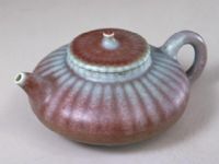 壺扁形,通體菊瓣式,圈足,壺身一側(cè)有短流,另一側(cè)為半環(huán)形曲柄。通體施鈞釉,外底有八處支釘燒痕,底印陰文“雍正年制”四字篆書款。