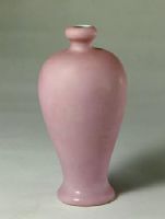 瓶口內(nèi)斂,口形如蒜頭,短頸,豐肩,肩以下漸斂,圈足微外撇。通體施淡粉色釉,屬低溫金紅釉。瓶里及底均施白釉。底青花雙圈內(nèi)楷書“大清雍正年制”六字款。