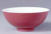 此瓶呈粉紅色的胭脂水釉勻凈光潔,在細白的底釉映襯下,更顯嬌麗。此碗制作過程是先燒出精致的白瓷小碗,然后采用噴釉的方法將釉漿均勻地噴射其上,再入低溫小爐在800℃的溫度下燒成,屬于清代稀有的色釉品種之一。胭脂水釉主要用于小件器,如小碗、小瓶、小高足杯、菊瓣盤等,是清代康熙年間新創(chuàng)的品種,雍正時期燒造得最為精致,乾隆朝之后直到晚清都在燒制,只是呈色越來越差。此小碗造型優(yōu)雅,小巧玲瓏,其底釉極白,胭脂水釉粉嫩嬌艷,代表了清代這一品種的最高成就。