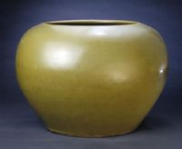 鱔魚黃釉屬于鐵、鎂結(jié)晶釉,清代宮廷檔案稱之為“廠官釉”。由于燒成工藝的某些差異,廠官釉的色調(diào)有多種變化。清雍正時期廠官釉品種名目繁多,如蟹甲青、鱔魚黃、瓜皮綠等。此缽釉色偏黃,色如鱔魚皮色,勻凈優(yōu)雅,且器型規(guī)整,為典型的雍正朝制品。
