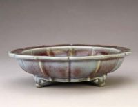盆托折沿,通體六瓣菱花式,下承以三個(gè)云頭形足。里外滿施仿鈞釉,底刻陽(yáng)文篆書(shū)“大清雍正年制”三行六字款。
