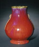 此瓶釉色鮮艷濃重,宛如燃燒的火焰般燦爛奪目,為窯變釉中“火焰紅”的典型作品。瓶的口沿處和耳部因釉層流動變薄而形成的燈草邊是雍正時(shí)期窯變釉類瓷器的特征之一。