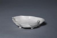 洗呈楸葉式,淺腹,底下承以不規(guī)則六足。通體施白釉。內(nèi)光素無紋飾,外壁清晰可見其葉脈,底堆貼盛開的梅花。
