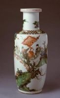 瓶盤口,直頸,斜肩,直腹,圈足。這種造型的瓶因形似古代洗衣用的棒槌,故被稱作“棒槌瓶”。內(nèi)外施白釉,外壁五彩裝飾?谶咃椉t彩,頸部繪竹石花卉兩組,肩部分布斜方錦地四組開光,開光內(nèi)分別繪山村草舍。腹壁主題圖案表現(xiàn)的是《隋唐演義》中的戰(zhàn)爭(zhēng)場(chǎng)面——秦叔寶策馬迎戰(zhàn)尉遲恭,唐王李世民和徐茂公臨城觀戰(zhàn),空間襯以矮山花樹。這種圖案俗稱“刀馬人”,清代康熙時(shí)期經(jīng)常用在陶瓷的裝飾畫面中。圈足內(nèi)施白釉。無款識(shí)。