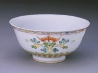 碗口外撇,弧腹,圈足。碗內(nèi)光素,碗外施粉彩圖案三組:口沿繪纏枝花一周;碗身飾折枝葫蘆上托紅色蝙蝠;近底處為變形蓮瓣紋。“蝙蝠”和“葫蘆”寓意“福祿”。外底青花雙方欄內(nèi)書(shū)“大清雍正年制”雙行六字楷書(shū)款。