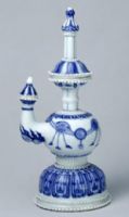 此壺造型仿藏族銀制賁巴壺?zé)於桑谱骶,新穎別致,青花發(fā)色濃艷。紋飾具有濃厚的少數(shù)民族藝術(shù)風(fēng)格,為瓷器中的精品。